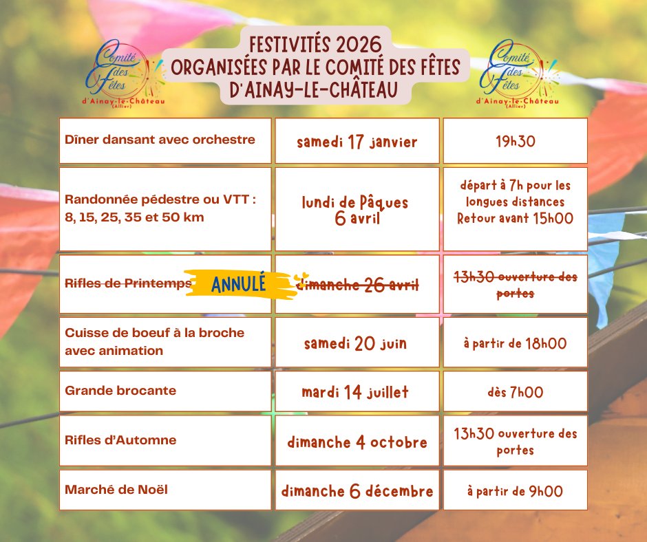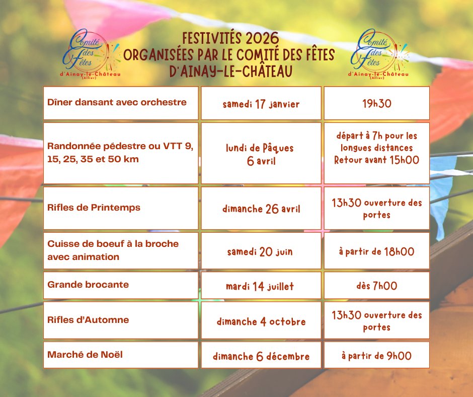 🚨 RÉSERVEZ VOS AGENDAS ! LE PROGRAMME 2026 DU COMITÉ DES FÊTES D'AINAY-LE-CHÂTEAU EST LÀ ! 🗓️